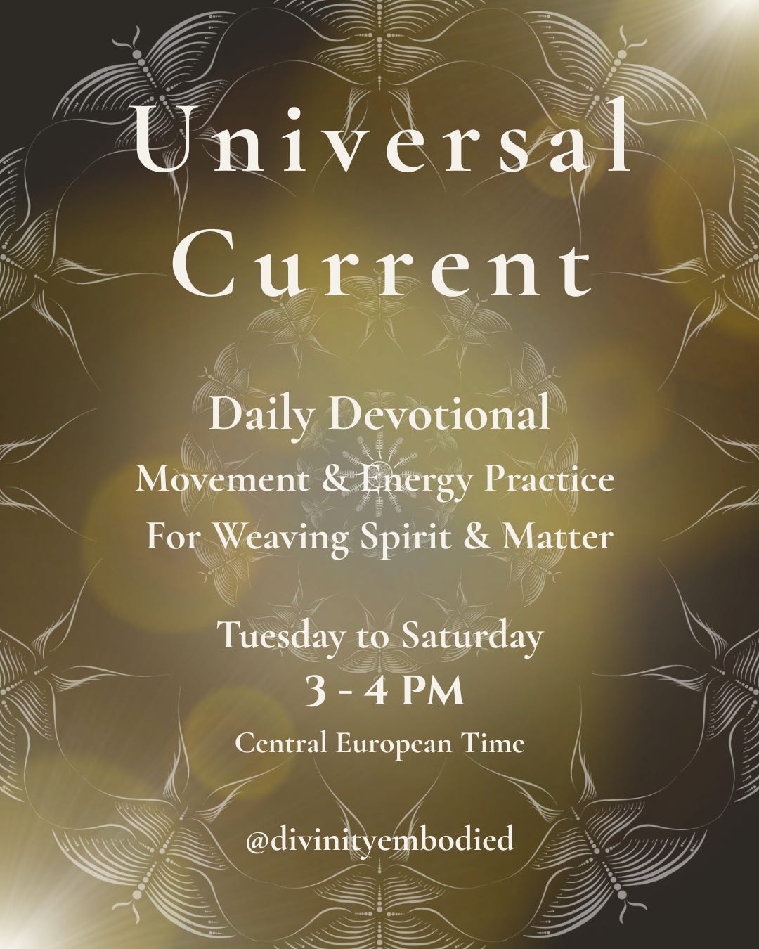 We are soul excited to announce that we will be meeting in this space every day for our Daily Devotional Practice - Universal Current. This daily class will be intuitively guided, incorporating essential core principals of expansion of consciousness through breath, movement, and energy work.